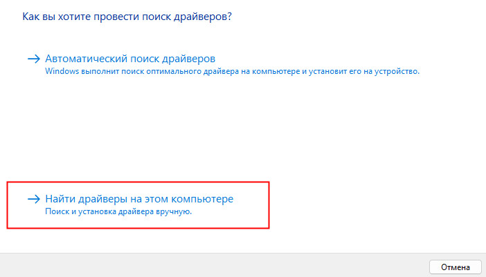 6. Из предложенного варианта выберите «Найти драйверы на этом компьютере -Поиск и установка драйвера вручную».