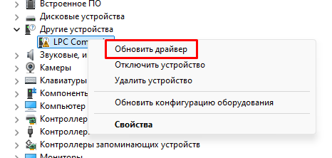 5. В «Диспетчере устройств» кликните правой клавишей мыши на неопознанное устройство LPC Composite и выберите «Обновить драйвер»