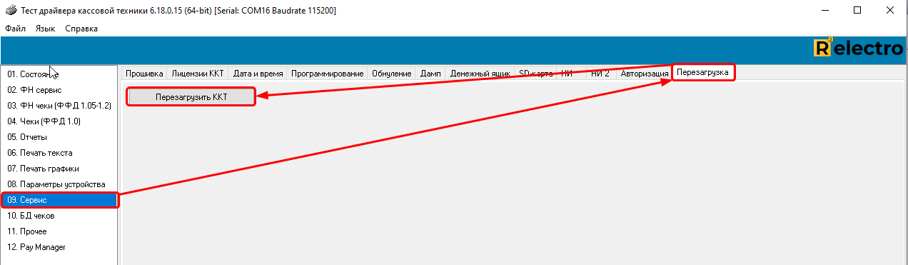 Если нет возможности перезагрузить, то есть включить и выключить аппарат, так как работаете удаленно, то заходим в тесте драйвера в 17. Прочее - Команда - Команда, HEX - FE F3 00 00 00 00 - Передать: