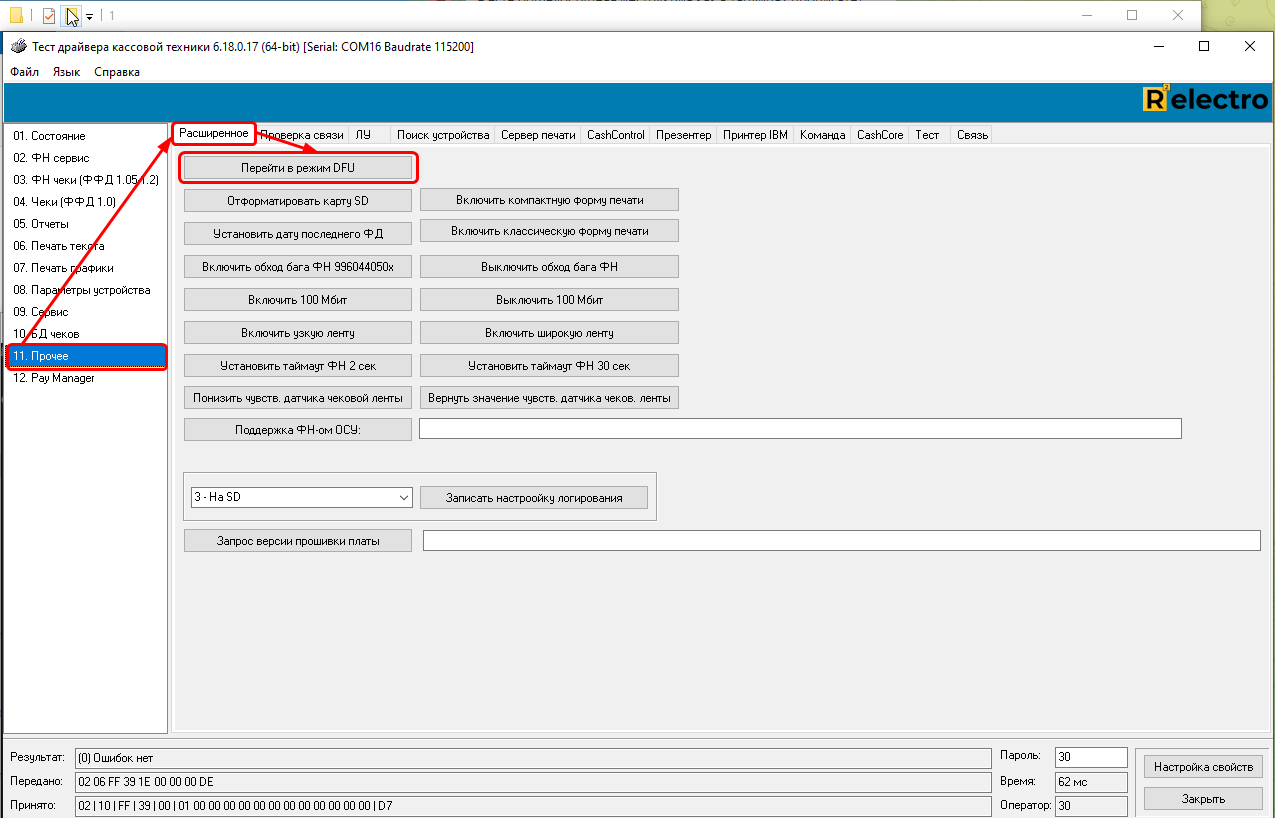 Запускаем тест драйвер, устанавливаем связь с кассой по USB, заходим в меню "Прочее", вкладка "Расширенное", нажимаем "Перейти в режим DFU"